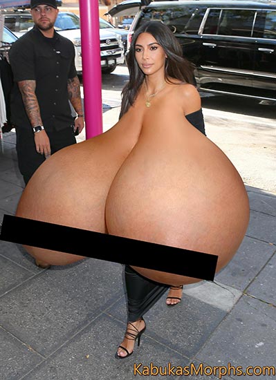 Breasts expansion morph samples of hot brunette Kim Kardashian exposing her naked huge tits on the streets.